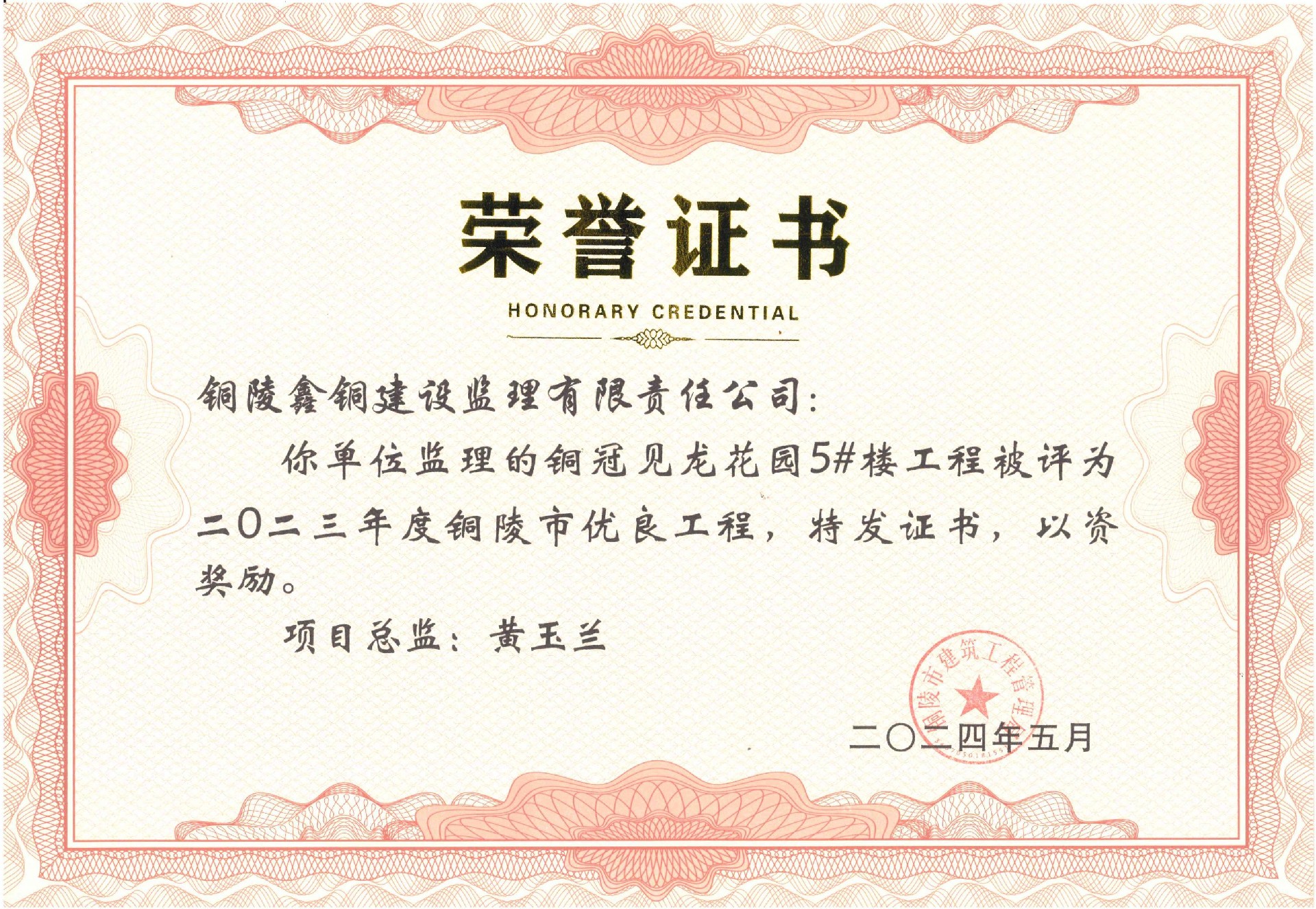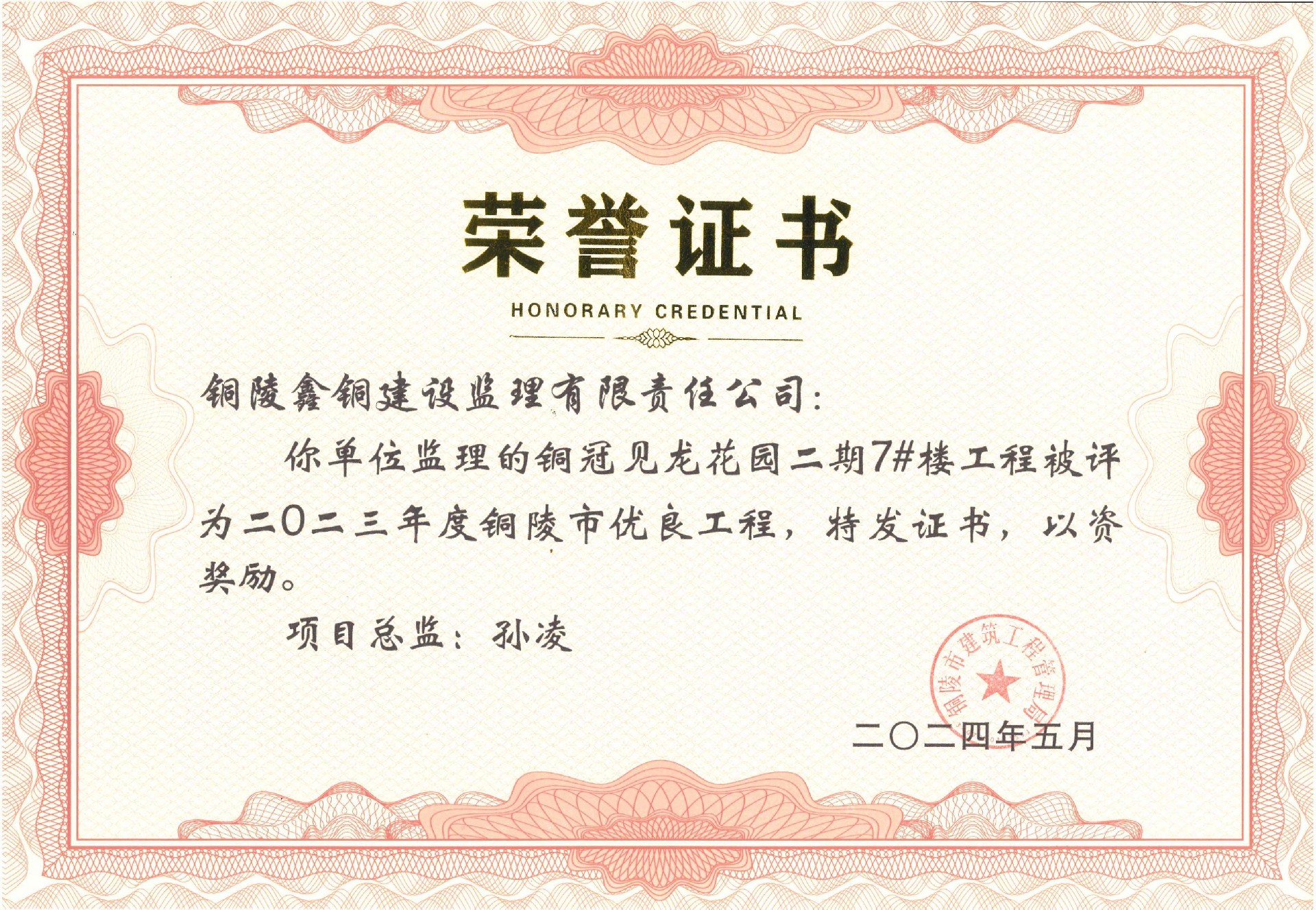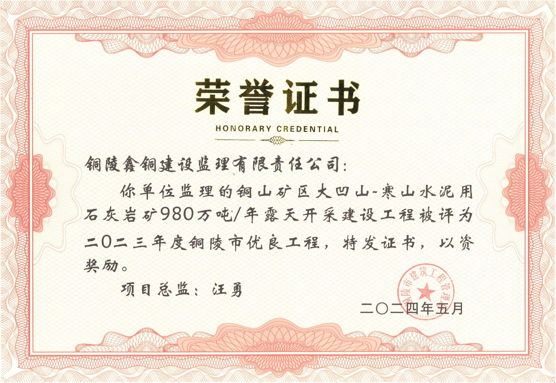 日前,由公司監(jiān)理的銅冠見龍花園5#樓工程、銅冠見龍花園二期7#樓工程、銅山礦區(qū)大四山-寒山水泥用石灰?guī)r礦980萬噸/年露天開采建設(shè)工程被評為二〇二三年度銅陵市優(yōu)良工程。